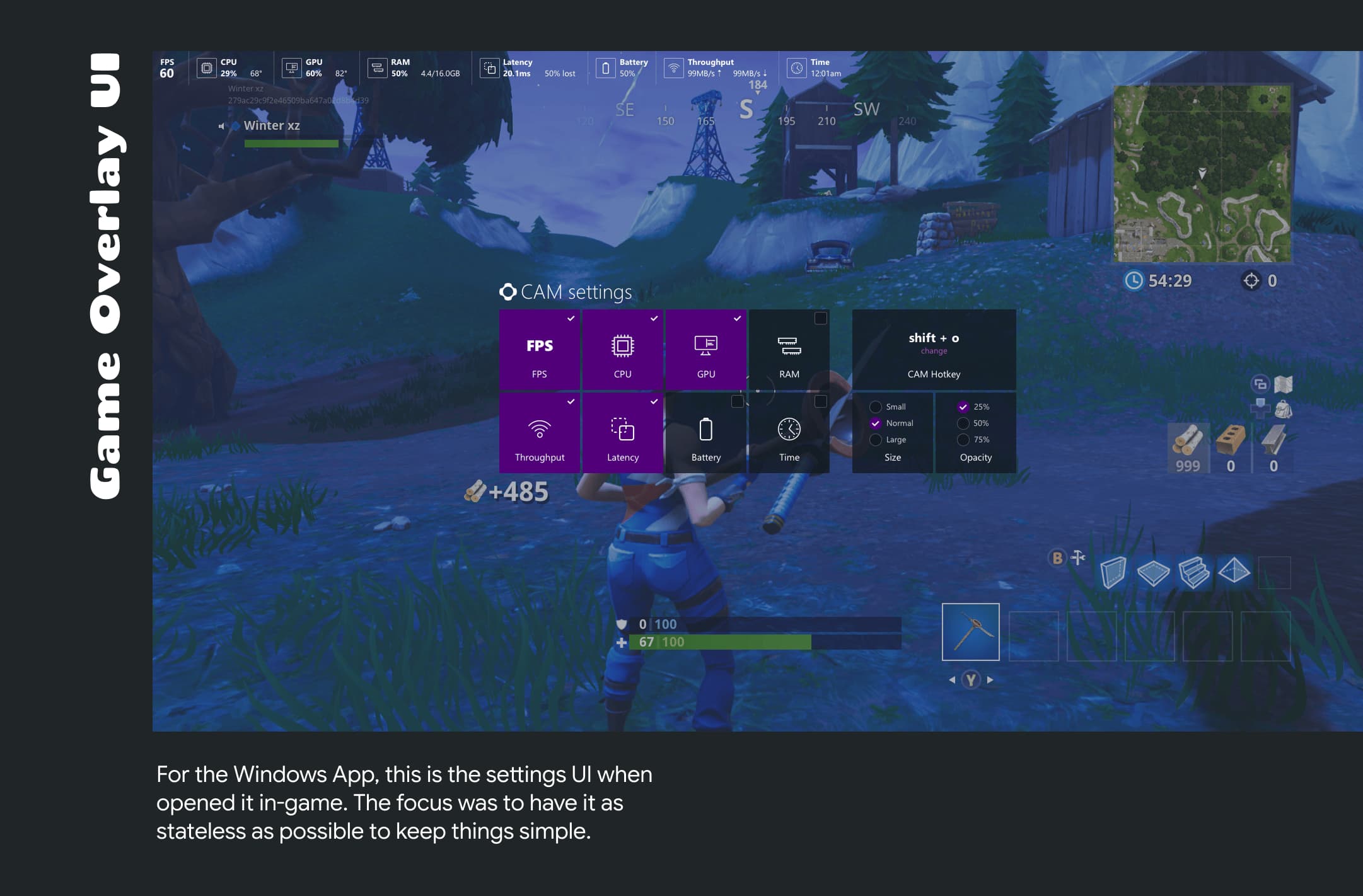 The Windows App, an electron app that is essentially the control center for the computers we sold. I thought it was important that it was an app you came in and out of quickly and not a full destination. In an industry known from preinstalled software bloat, this was a chance to do it right. Gamers are sensitive to unnecessary software that slows a computer down so the aim was to make an app that felt small but powerful. What you see here is an information dense desktop experience with a light in-game experience.